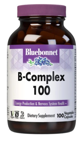Bluebonnet's B-Complex 100 Vegetable Capsules are formulated with a full spectrum of high potency B vitamins which play a complementary role in maintaining physiologic and metabolic functions that support energy production and nervous system health.