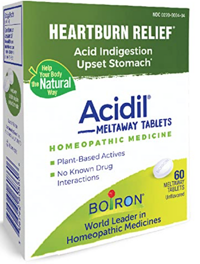 Stop the churning and burning with Boiron Acidil meltaway tablets that melt in your mouth to relieve occasional heartburn, acid indigestion, bloating, and upset stomach.* This homeopathic medicine is made with plant-based active ingredients and can be taken on a full or empty stomach.
