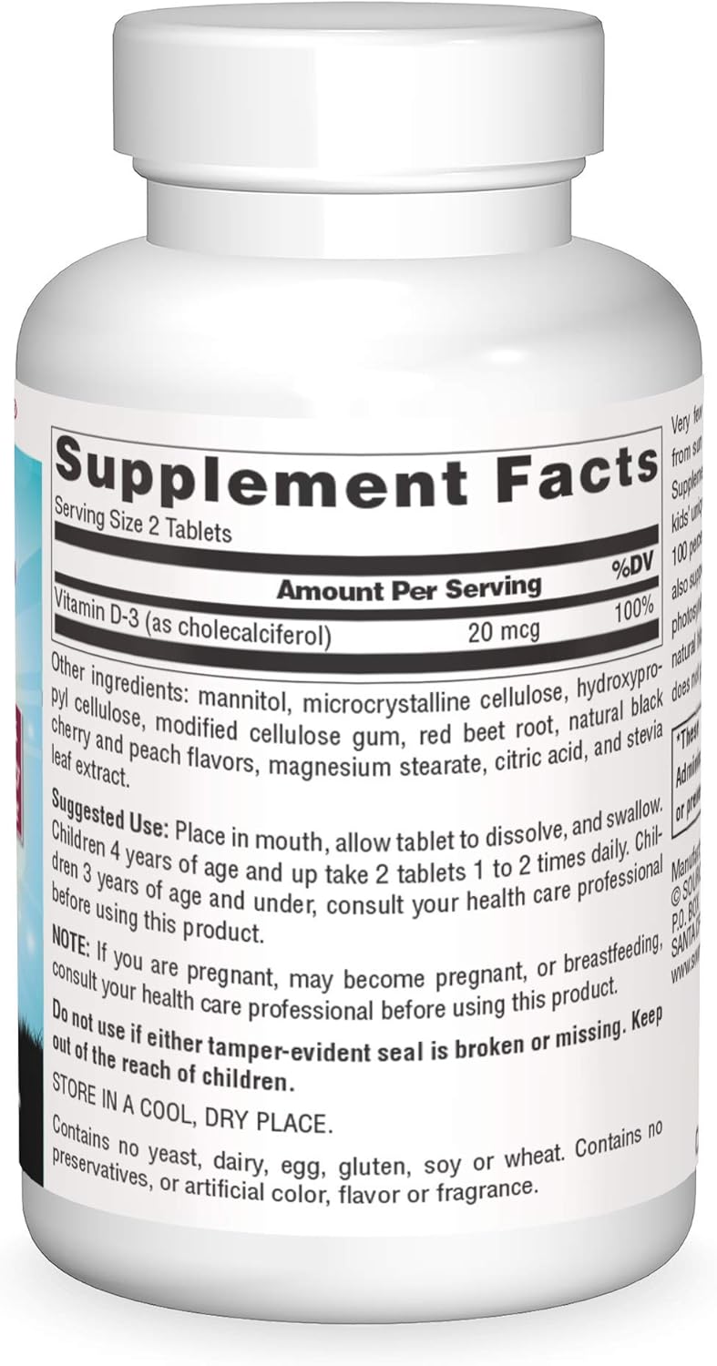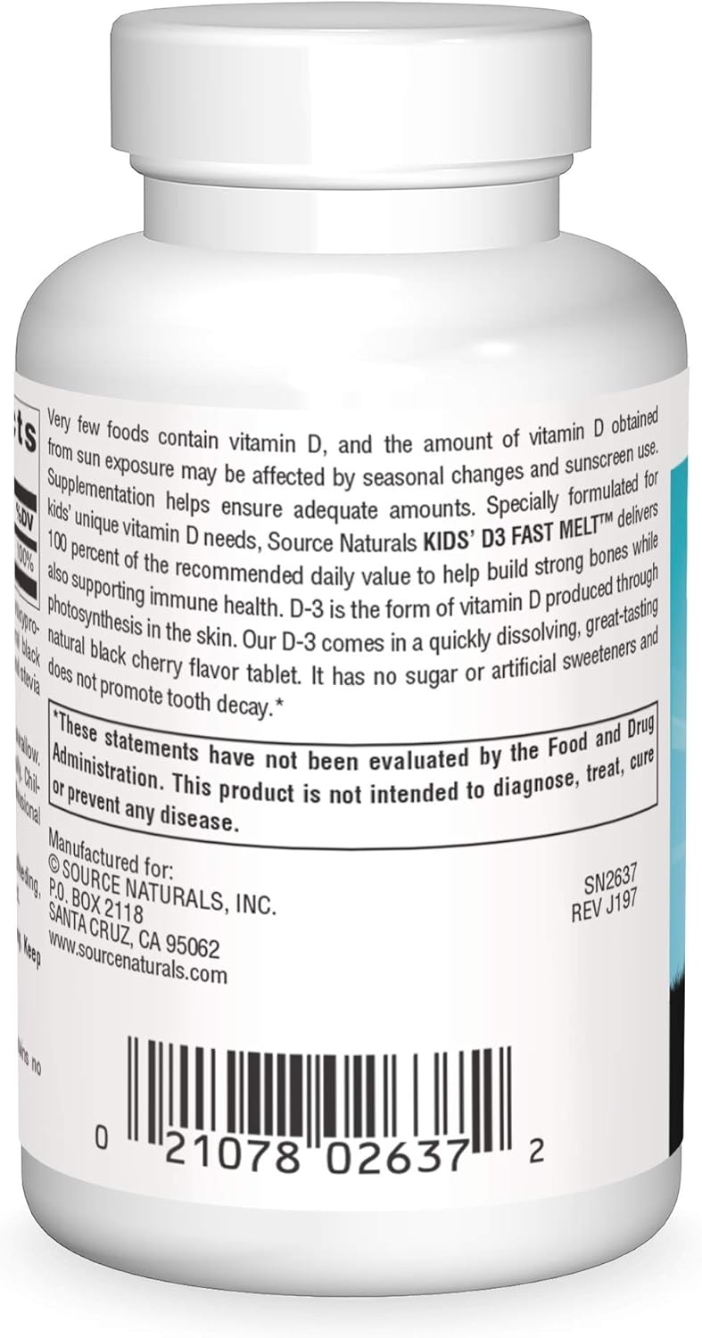 Very few foods contain vitamin D, and the amount of vitamin D obtained from sun exposure may be affected by seasonal changes and sunscreen use. Supplementation helps ensure adequate amounts. Specially formulated for kids' unique vitamin D needs, Source Naturals Kids' D3 Fast Melt™ delivers 100 percent of the recommended daily value to help build strong bones while also supporting immune health. D-3 is the form of vitamin D produced through photosynthesis in the skin. Our D-3 comes in a quickly dissolving, great-tasting natural black cherry flavor tablet. It has no sugar or artificial sweeteners and does not promote tooth decay.