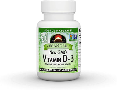 Unlike most vitamin D supplements, which are from sheep's Wool, VEGAN TRUE® NON-GMO VITAMIN D-3 is a non-GMO, organic, and vegan form of vitamin D sourced from algae. Our bodies manufacture vitamin D when the skin is exposed to UV radiation from sunlight, but our ability to do so decreases as we age. Insufficient amounts of sun exposure as well as aging create a risk of vitamin D deficiency. Vitamin D is important for immune function and a positive mood, and vital for the maintenance of healthy bones & muscles. Vegan True Non-GMO Vitamin D-3 provides a high potency (250%) of the recommended daily value and does not contain any animal products or animal-derived ingredients.