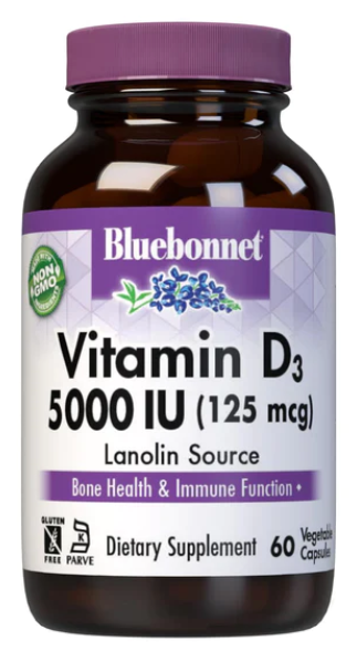 Bluebonnet's Vitamin D3 5000 IU Capsules provide pure vitamin D3 (cholecalciferol) from lanolin. Available in easy-to-swallow capsules for maximum assimilation and absorption.