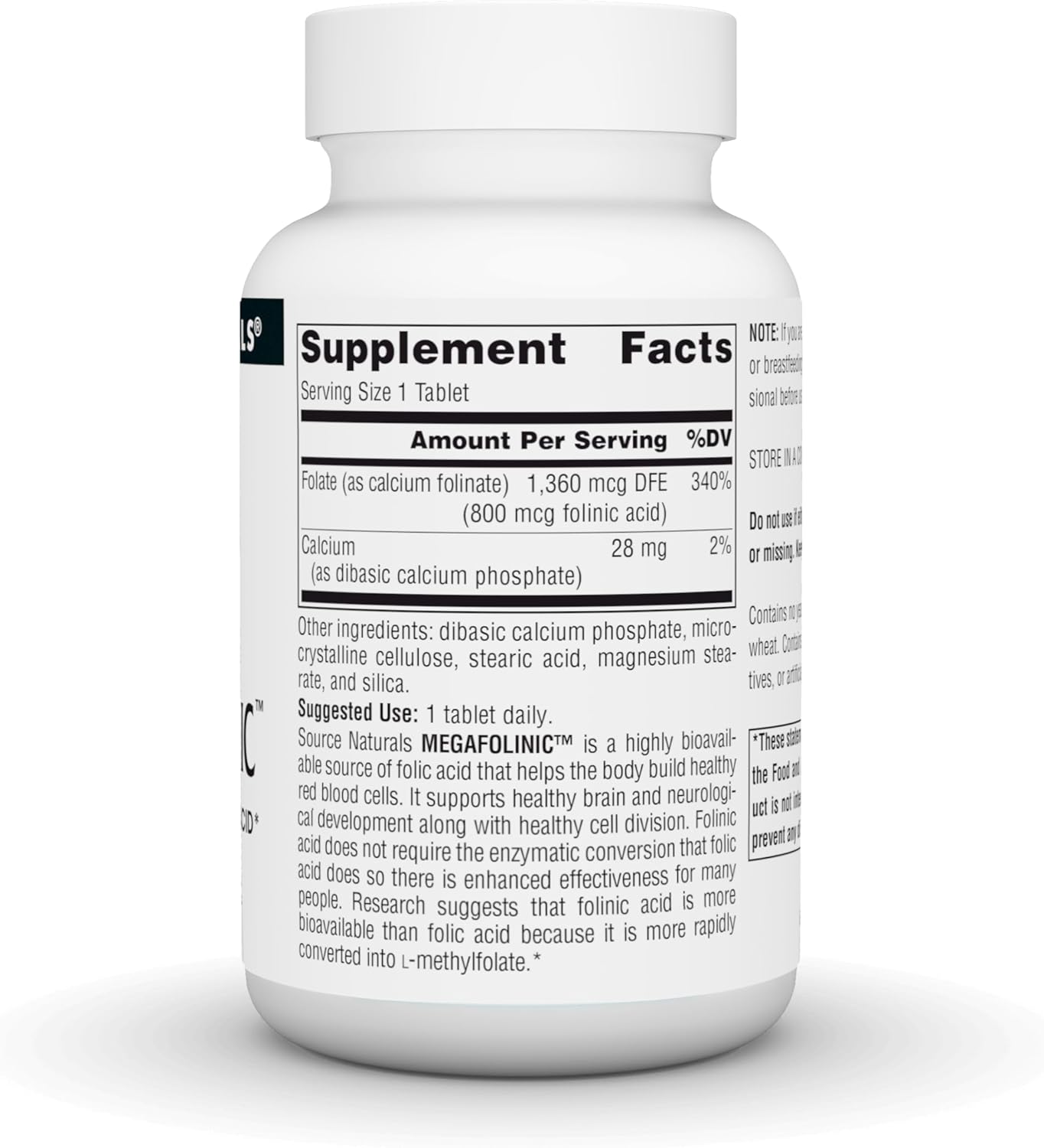 Source Naturals MegaFolinic™ is a highly bioavailable source of folic acid that helps the body build healthy red blood cells. It supports healthy brain and neurological development along with healthy cell division. Folinic acid does not require the enzymatic conversion that folic acid does so there is enhanced effectiveness for many people. Research suggests that folinic acid is more bioavailable than folic acid because it is more rapidly converted into L-methylfolate.