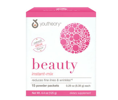 Youtheory® Beauty Instant-Mix is a multi-action skin formula that revitalizes and protects from the inside out. This unique combination of skin food nutrients can help combat the visible signs of aging, while boosting the skin’s antioxidant defenses.