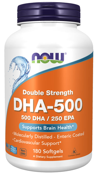 NOW DHA-500 has twice the DHA (500 mg per softgel) as in our regular strength product (250 mg per softgel). The natural fish oil concentrate used in this softgel is manufactured under strict quality control standards. It is tested to be free of potentially harmful levels of contaminants (i.e. mercury, heavy metals, PCB’s, dioxins, and other contaminants). Those who experience nausea or reflux from other fish oils should find this enteric-coated, odorcontrolled softgel easier to tolerate.