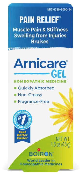 A homeopathic medicine, Arnicare Gel does not contain menthol, camphor, methyl salicylate, capsaicin, fragrances, dyes, or parabens. It does not mask symptoms that may indicate a more serious condition. Arnicare Gel is available over the counter in 1.5 oz and 2.6 oz tubes and a 4.2 oz value-size tubes.