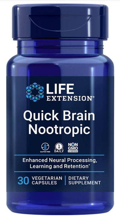 A “nootropic” is a nutrient that helps enhance learning, cognition and mental processing speed. Our Quick Brain formula combines three clinically studied ingredients that promote neural processing speed/fast thinking, memory and concentration: carotenoid-rich marigold extract, standardized gotu kola extract and whole-herb BaCognize® bacopa extract.