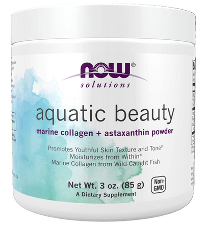 NOW® Solutions Aquatic Beauty features wild-caught fish collagen and astaxanthin, which has been found in clinical studies to maintain youthful skin moisture and texture and promote even skin tone.