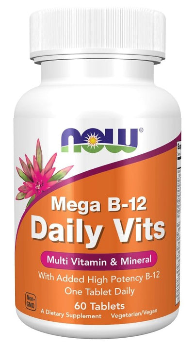 NOW Mega B-12 Daily Vits is a multivitamin and mineral supplement with high potency B-12. Multiple vitamins help to bridge the nutrient gap in our daily diets. In today's world of processed foods and fast-paced lifestyles, many of us do not get the daily recommended allowance of vitamins, minerals and other nutrients. Multiple vitamins can help fill in the areas lacking in our diets, and are formulated to provide a broad range of nutrition.