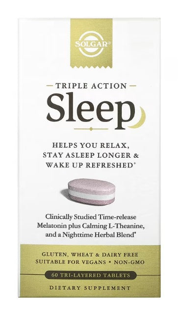 Solgar® Triple action sleep leverages clinically studied time-release technology that allows each tablet layer to... dissolve at different times throughout the night. So it helps you relax... Get a good night's sleep... and wake up ready to take on the day!