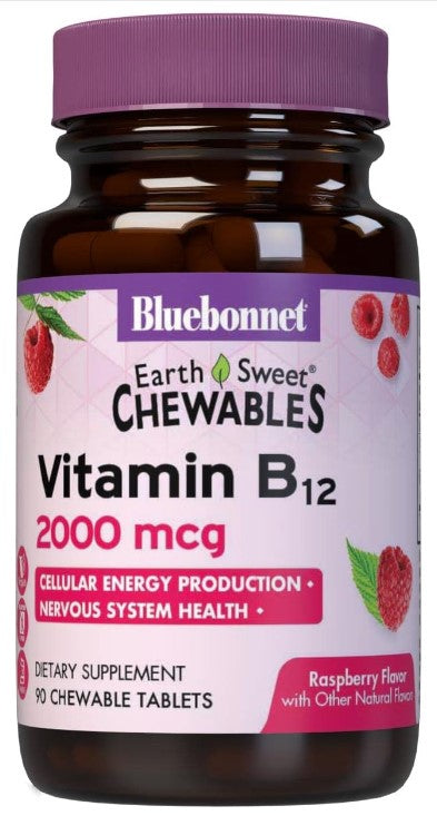 Bluebonnet's EarthSweet® Chewables Vitamin B12 2000 mcg Tablets are formulated with crystalline vitamin B12 that supports cellular energy production and nervous system health in a delicious raspberry flavor. Sweetened with EarthSweet® a proprietary sweetening mix of fruit powders and sugar cane crystals.