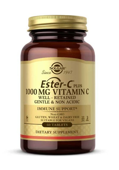 Solgar Ester-C Plus 1000mg Vitamin C provides a unique, pH neutral, non-acidic vitamin C with bioflavonoids, acerola berry and rose hips fruit powder for immune support.