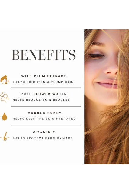 Water, Rose flower water, Glycerine, Mānuka honey, Kakadu plum extract, Illawarra plum extract, Burdekin plum extract, Vitamin E, Sunflower seed oil, Gluconolactone, Sodium