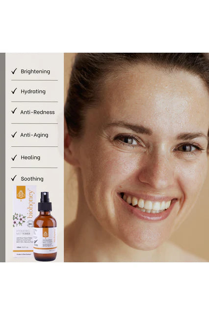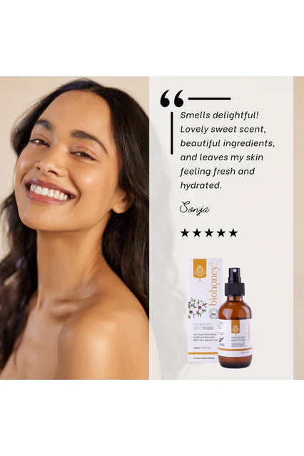 Biohoney’s Hydrating Mist Toner is a gentle, nutrient-rich toner designed for all skin types, including sensitive skin. It uses rose flower water and wild plum extracts to promote radiant, youthful skin. Enriched with MGO300+ New Zealand mānuka honey, it hydrates and revitalizes the skin, leaving it refreshed.